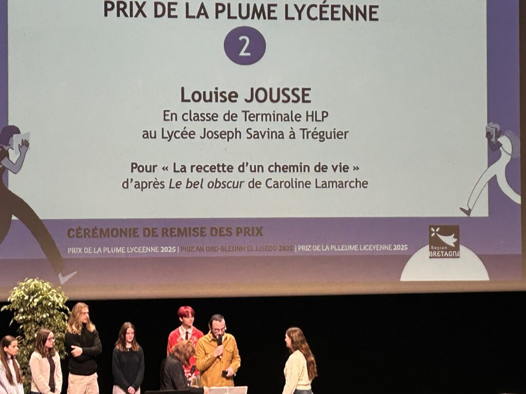 Cette année, la participation du lycée Joseph Savina au concours « Plume Lycéenne », organisé en partenariat avec l’association « Bruit de Lire » et la région Bretagne, a été un beau succès. Louise Jousse, élève en terminale HLP, a en effet remporté le deuxième prix du concours de critique littéraire organisé par l’académie de Rennes. Elle avait choisi d’analyser l’œuvre de Caroline Lamarche, « Le bel Obscur », issue de la sélection du prix Goncourt.