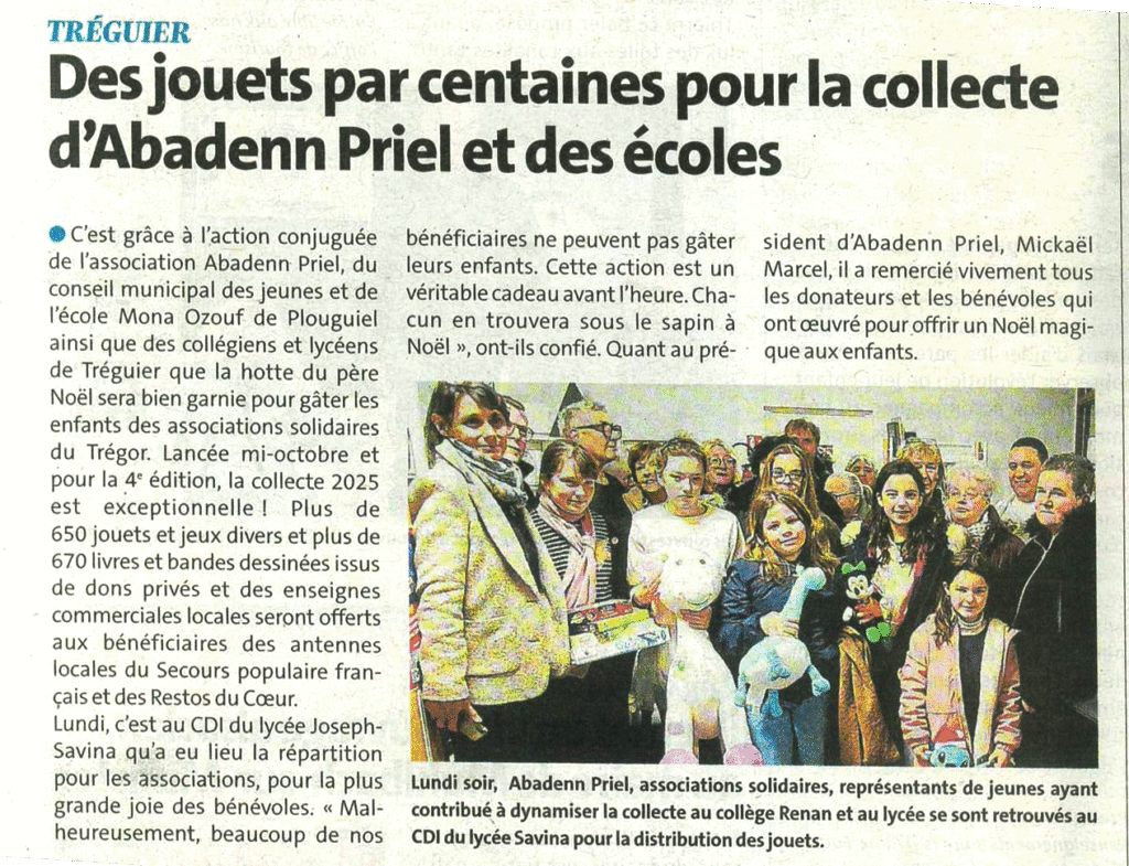 Des jouets par centaines pour la collecte d’Abadenn Priel et des écoles. Le Télégramme [en ligne]. 2025, Chez Vous, 8 [consulté le 5 décembre 2025]. Disponible sur : https://www.letelegramme.fr/cotes-d-armor/treguier-22220/des-jouets-par-centaines-pour-la-collecte-dabadenn-priel-et-des-ecoles-de-treguier-6940027.php